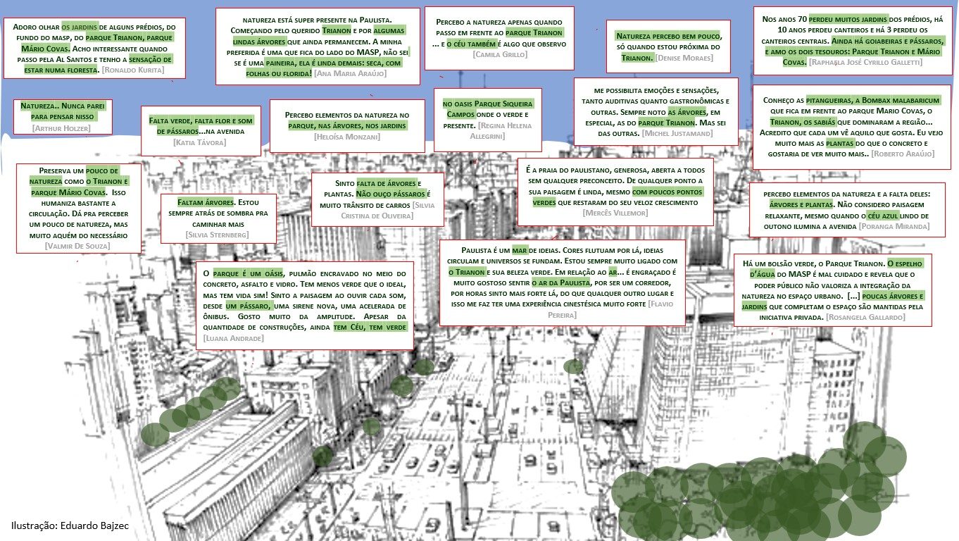 Ficou claro que os elementos naturais existentes na paisagem real da Avenida foram poucos lembrados e citados pelos entrevistados. Por, exemplo, houve menção ao Parque Trianon e ao céu. E, de maneira curiosa, a natureza esteve presente nos comentários por meio de metáforas como “mar de gente”, “oásis verde”, “jardim”, “meu quintal”, “floresta” e “praia”.